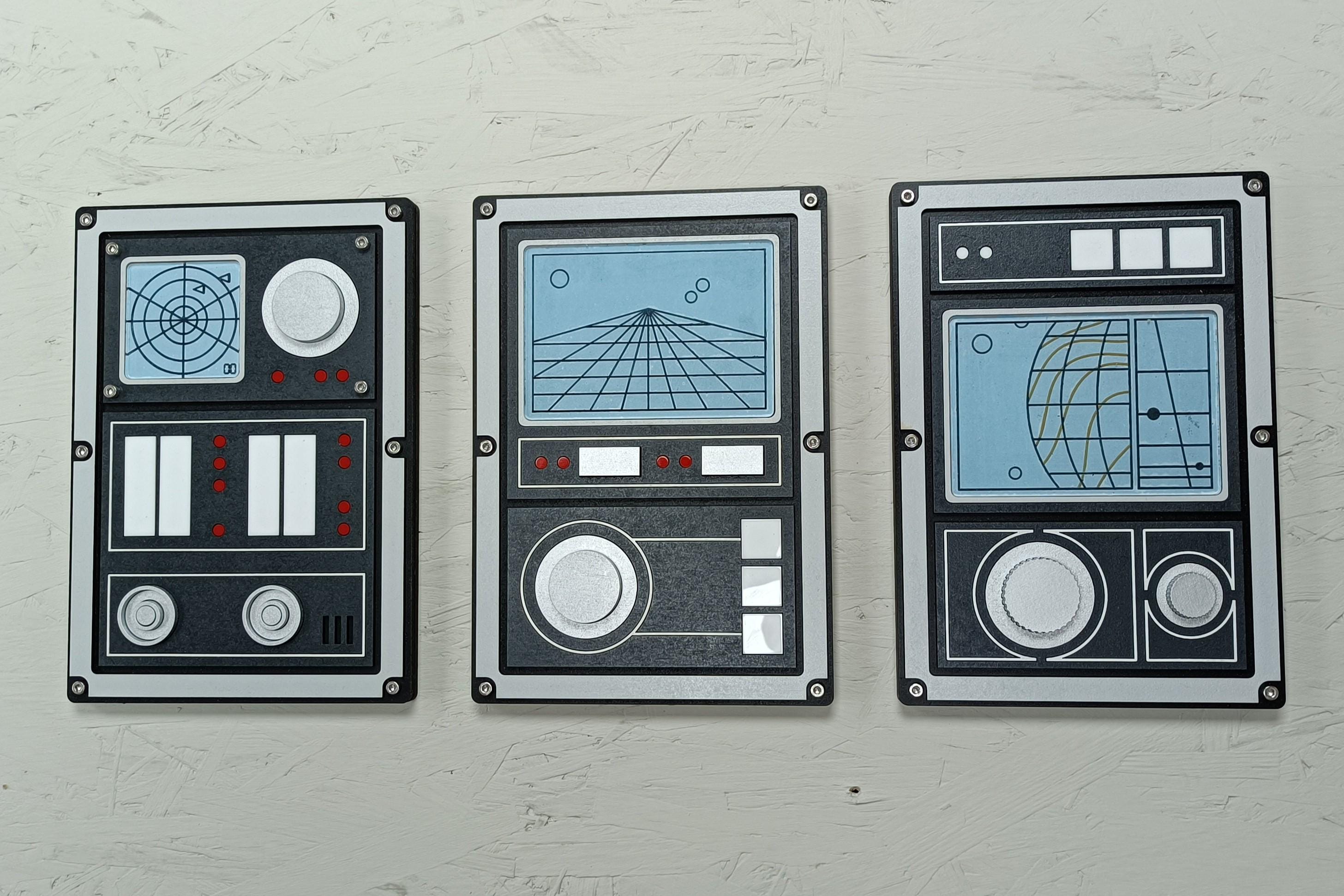 Crafted from layers of laser-cut MDF and acrylic, and finished with real stainless steel bolt heads and laser-etched details, painted in bold blacks, greys, and chrome tones, they capture the essence of classic science fiction technology.