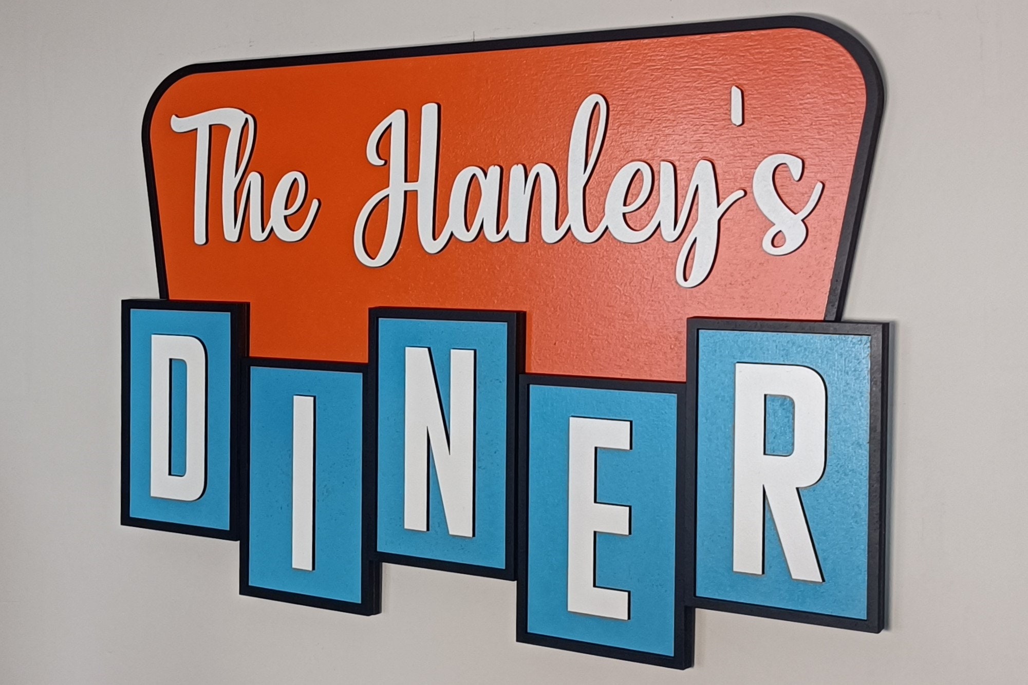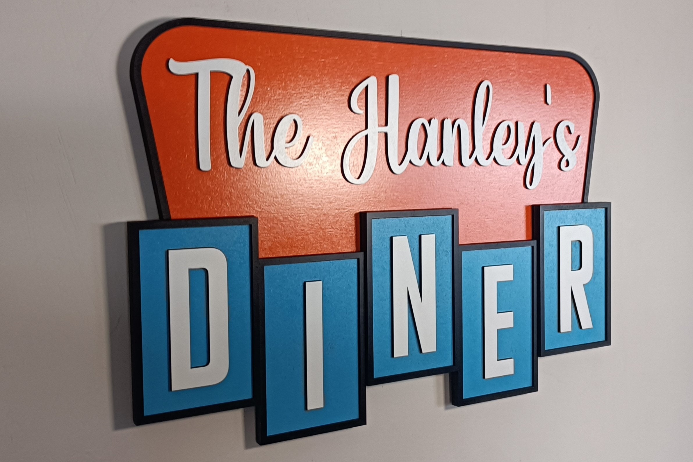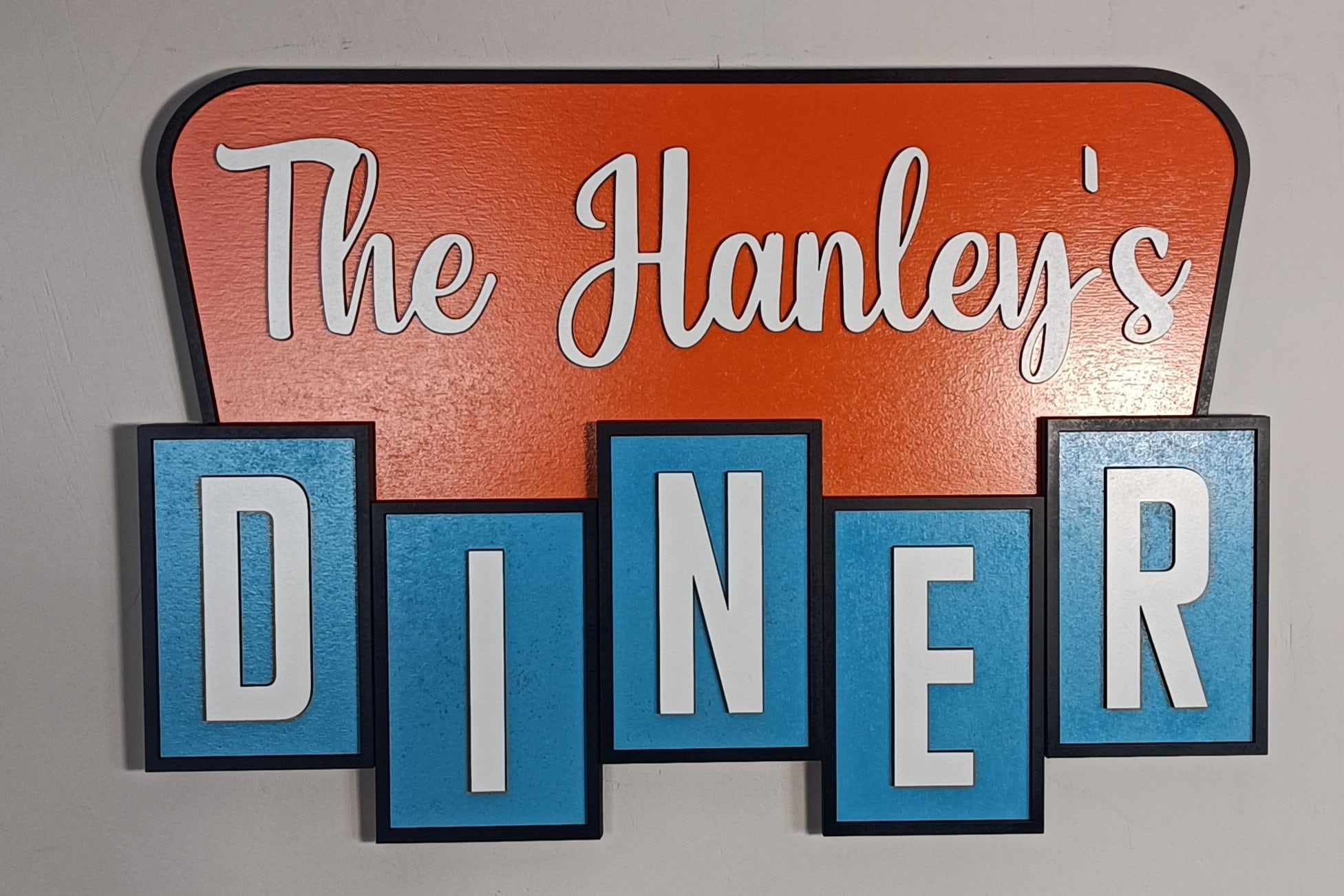 Made from layers of laser cut MDF to recreate the 3 dimensional look of vintage diner signs the top line can be personalised with your choice of name, whether that be a first name, family name or even something like Mum's diner the choice is up to you.