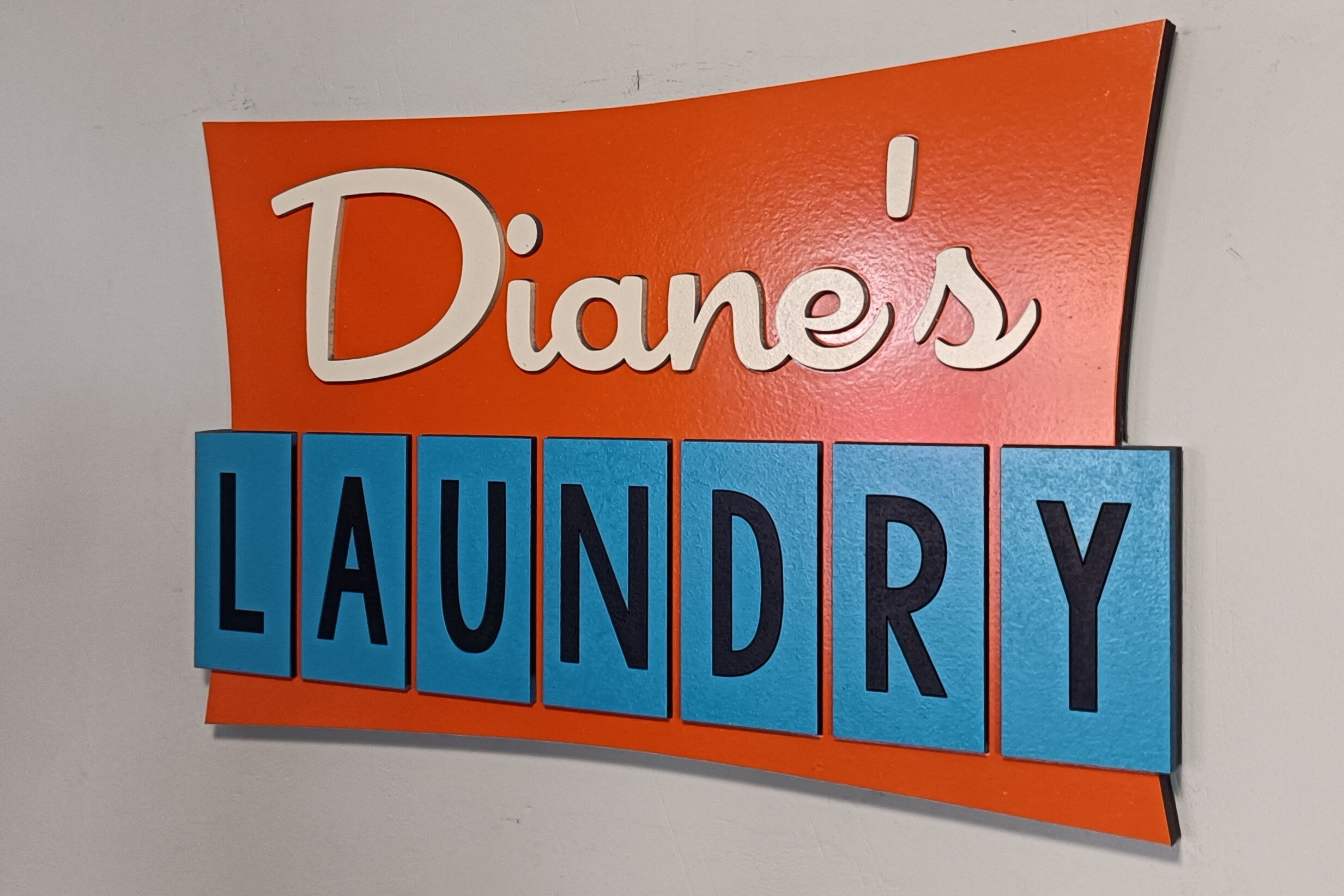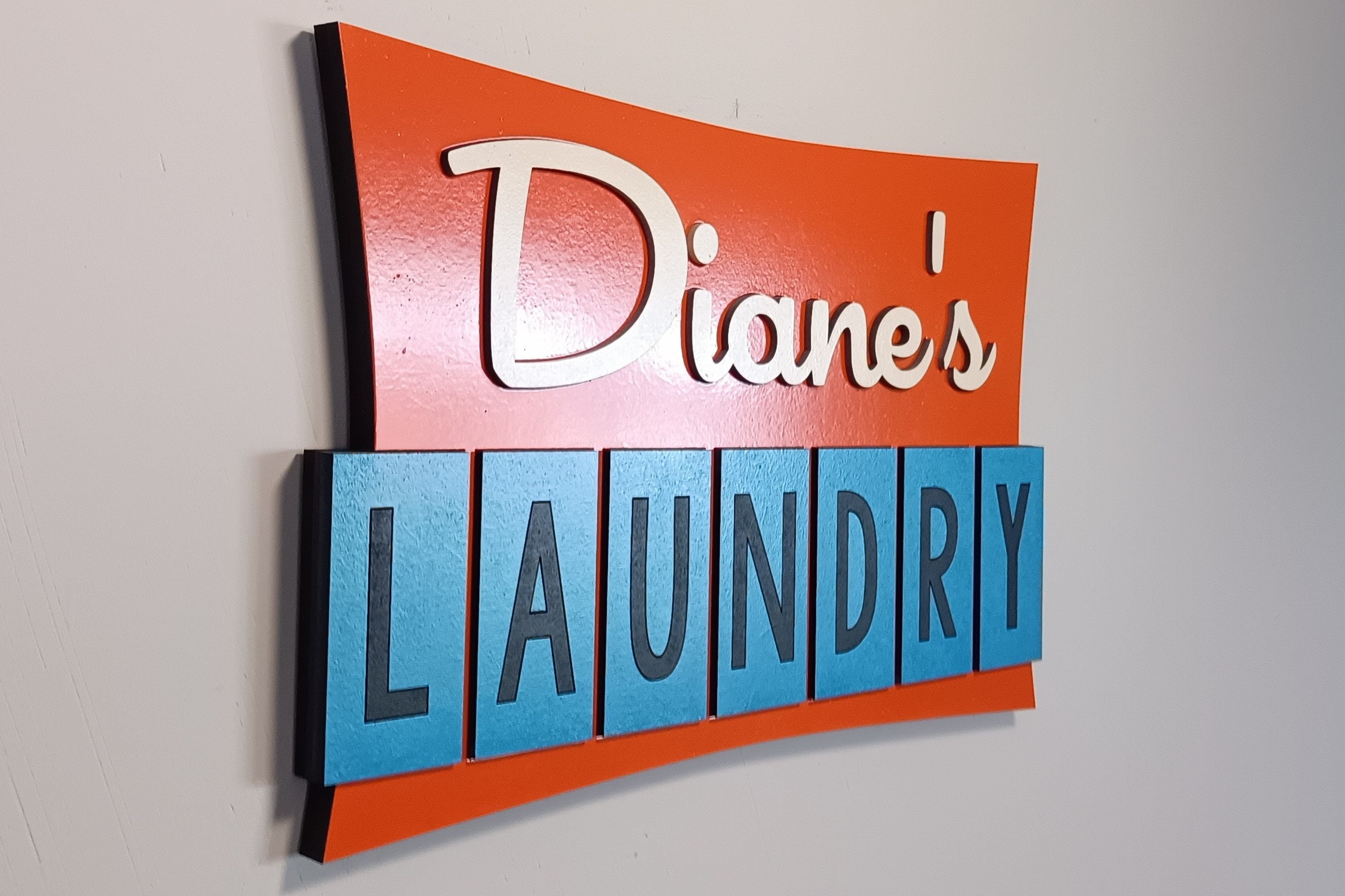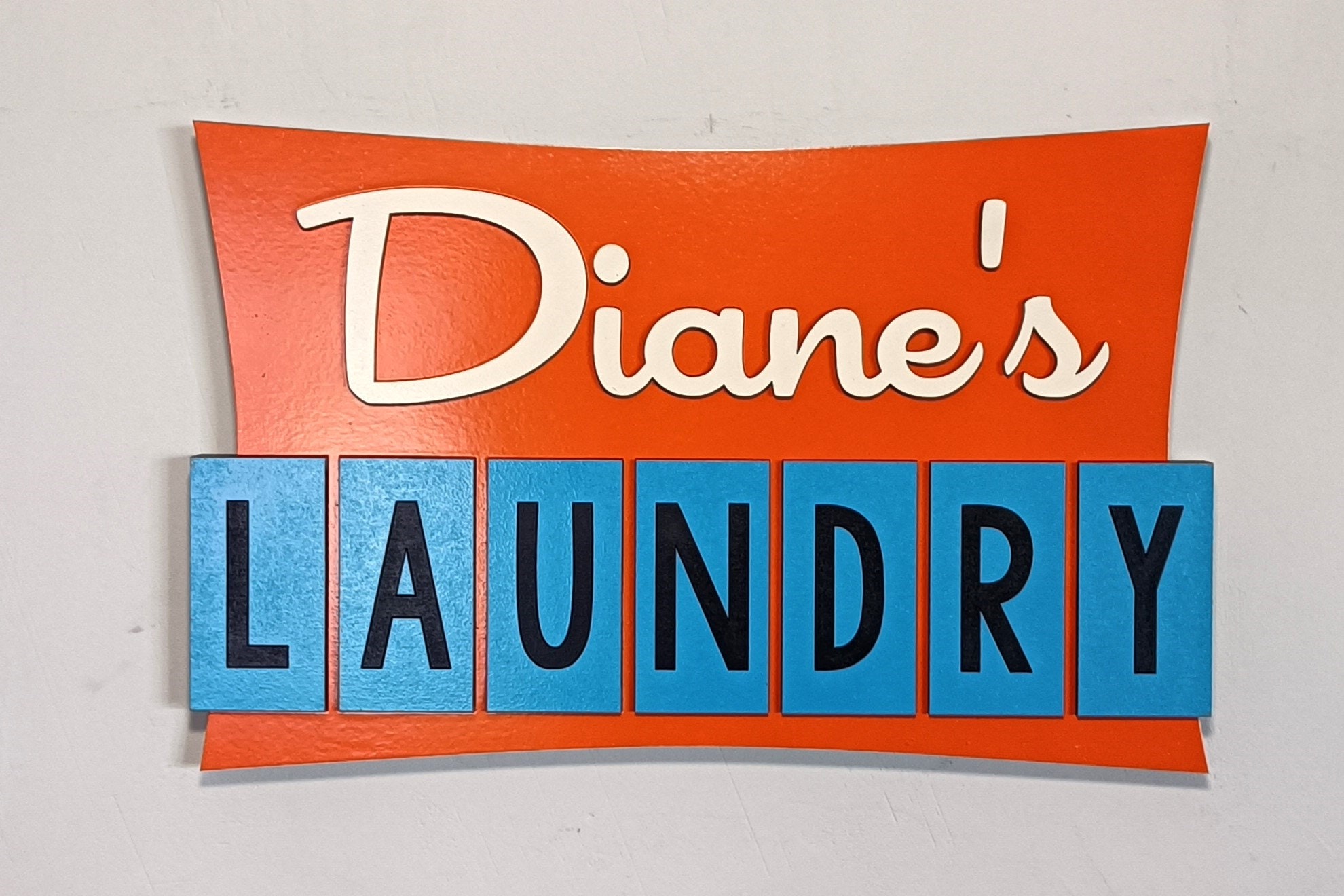 Made from layers of laser cut MDF to recreate the 3 dimensional look of vintage signs the top line can be personalised with your choice of name, whether that be a first name, family name or even something like Mum's Laundry the choice is up to you.