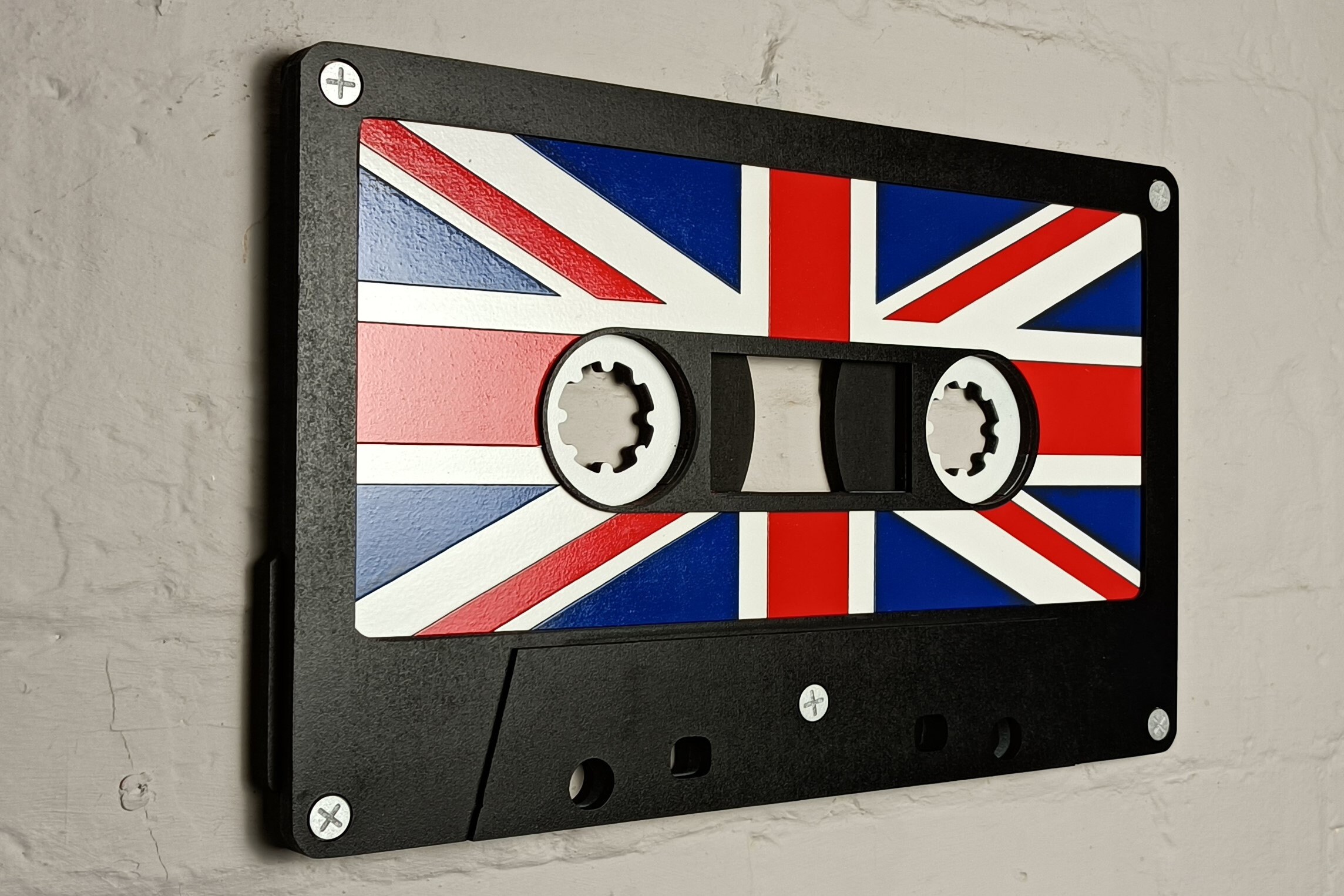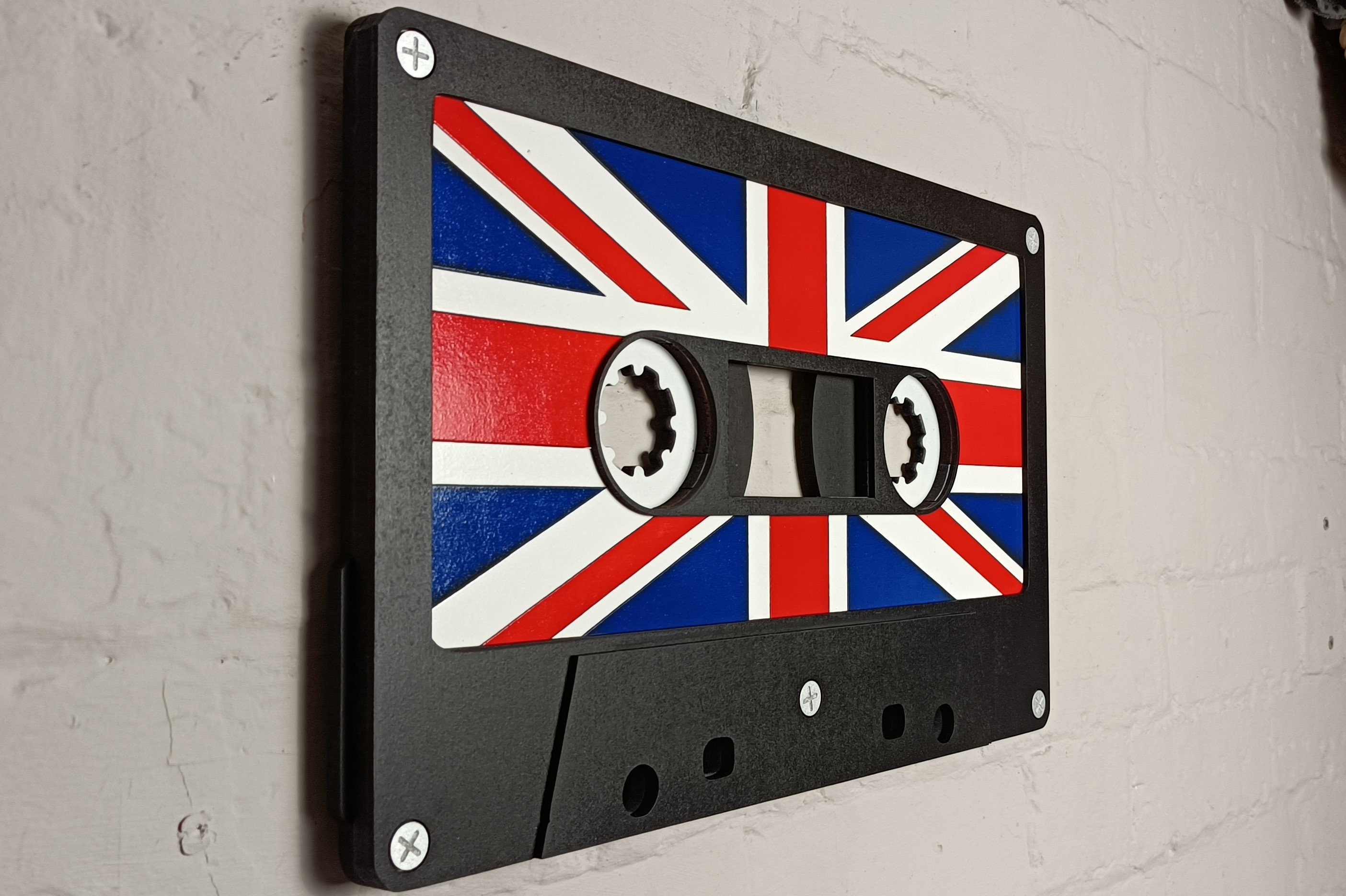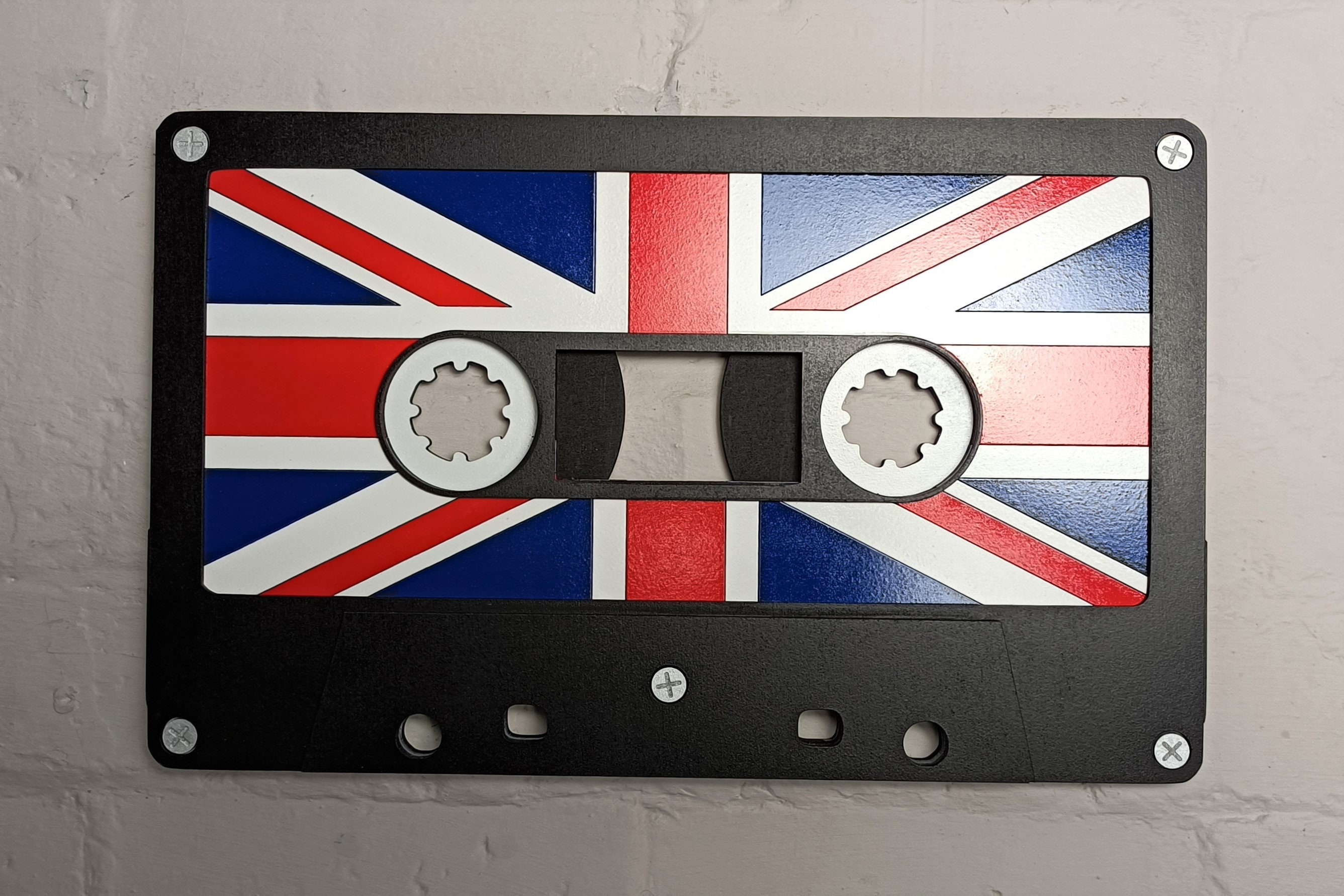 Bring back the nostalgia of the 80s with this bold and vibrant Union Jack retro cassette tape wall art. Designed as a realistic, oversized version of a classic music tape, this eye-catching piece is perfect for anyone who loves retro décor or wants to add a unique conversation starter to their home.