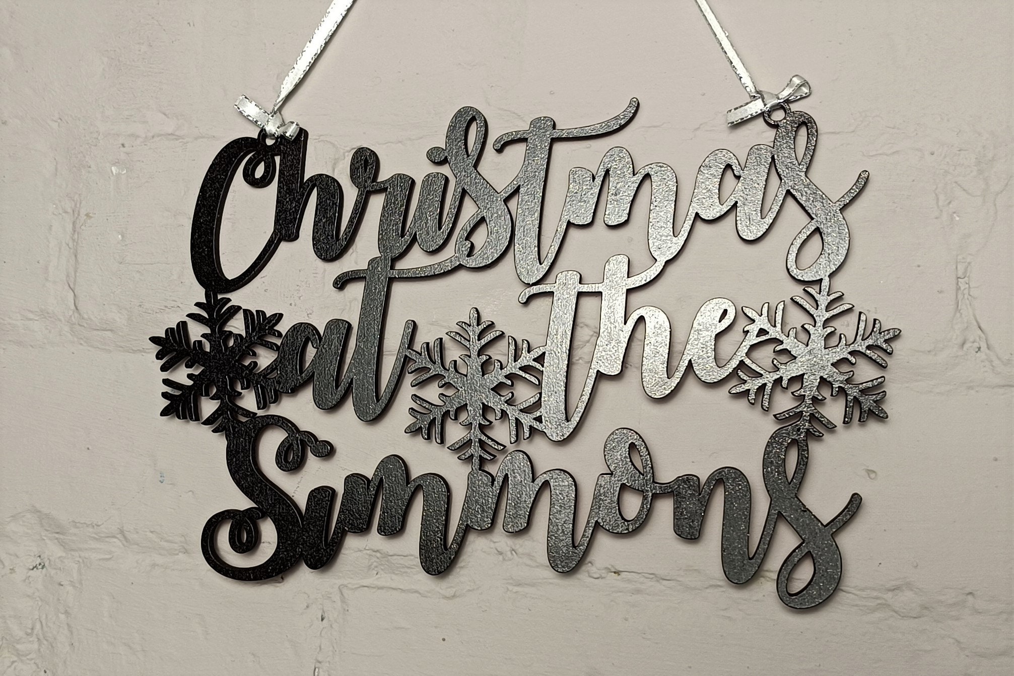 Each sign is customised with your chosen name and finished in your choice of glitter colours- Red, Dark Green or Black - or Metallic colours - Gold, Silver or Copper - so you can match your Christmas decorations perfectly.