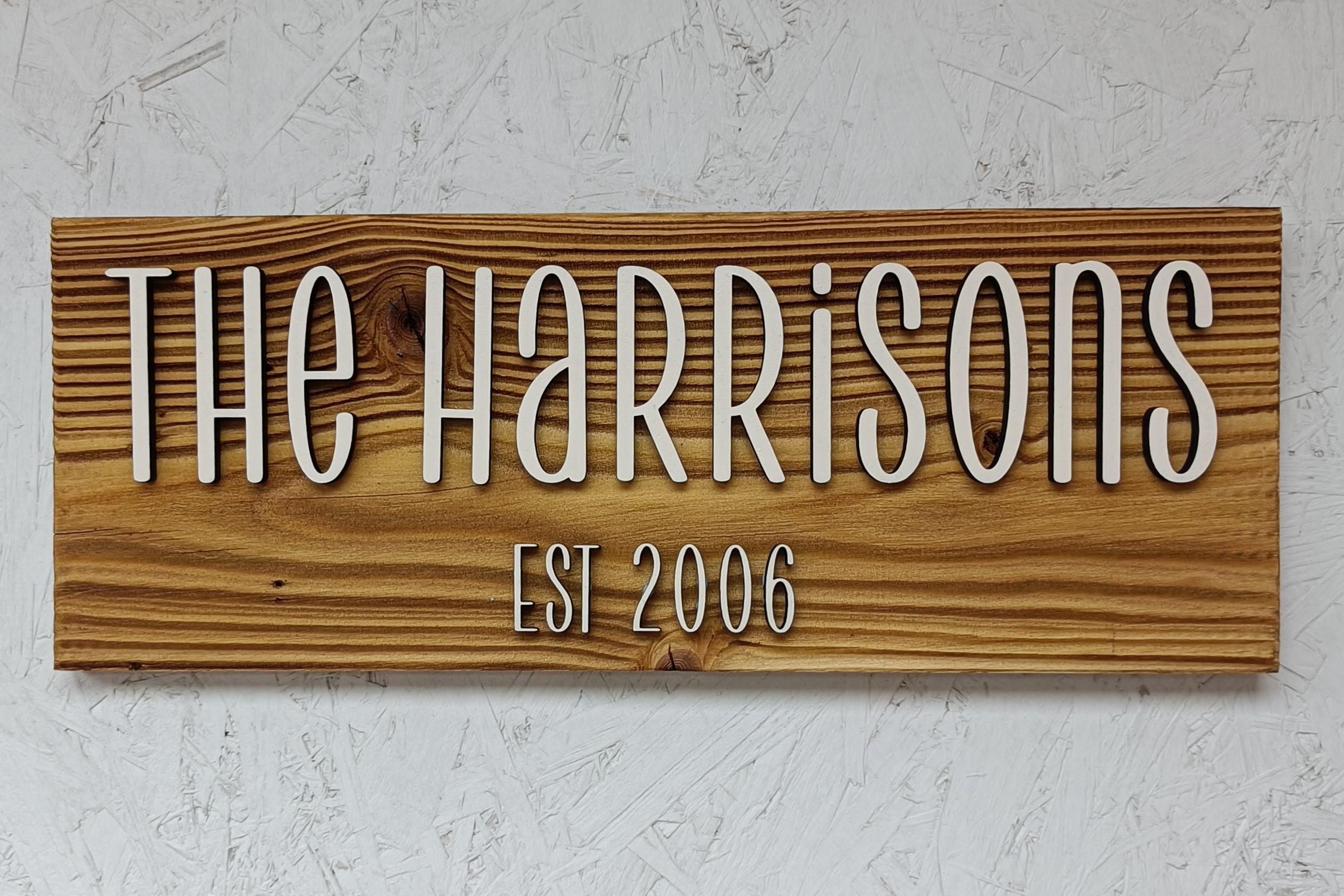 Celebrate your home’s story with this beautifully handcrafted personalised family name sign, featuring a choice of two elegant font styles painted in smooth satin ivory. Your chosen family name and special Est date sit proudly on a solid pine background deeply laser engraved creating a unique heavily textured 3D rustic finish with a golden colour to really set off the beauty of the wood