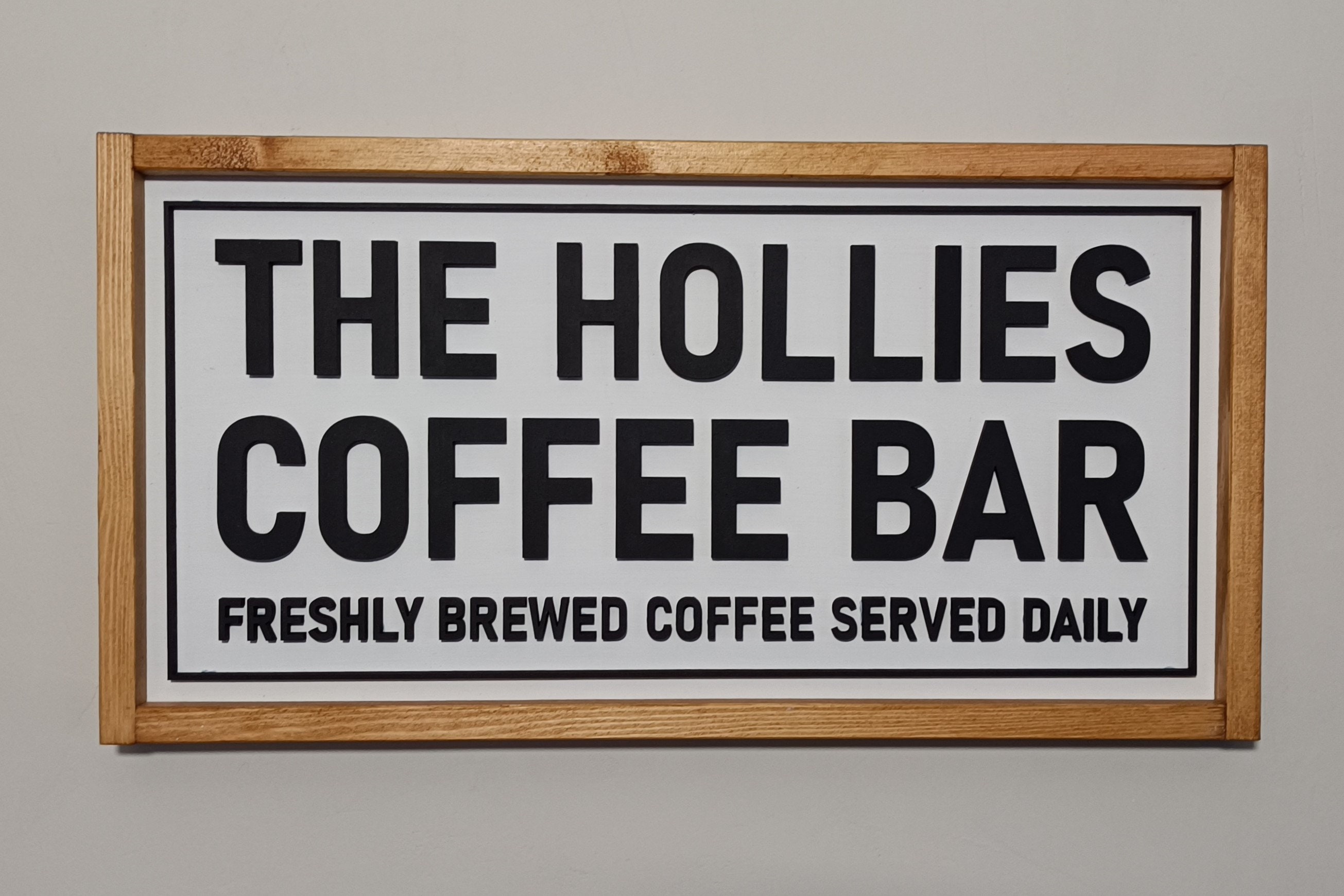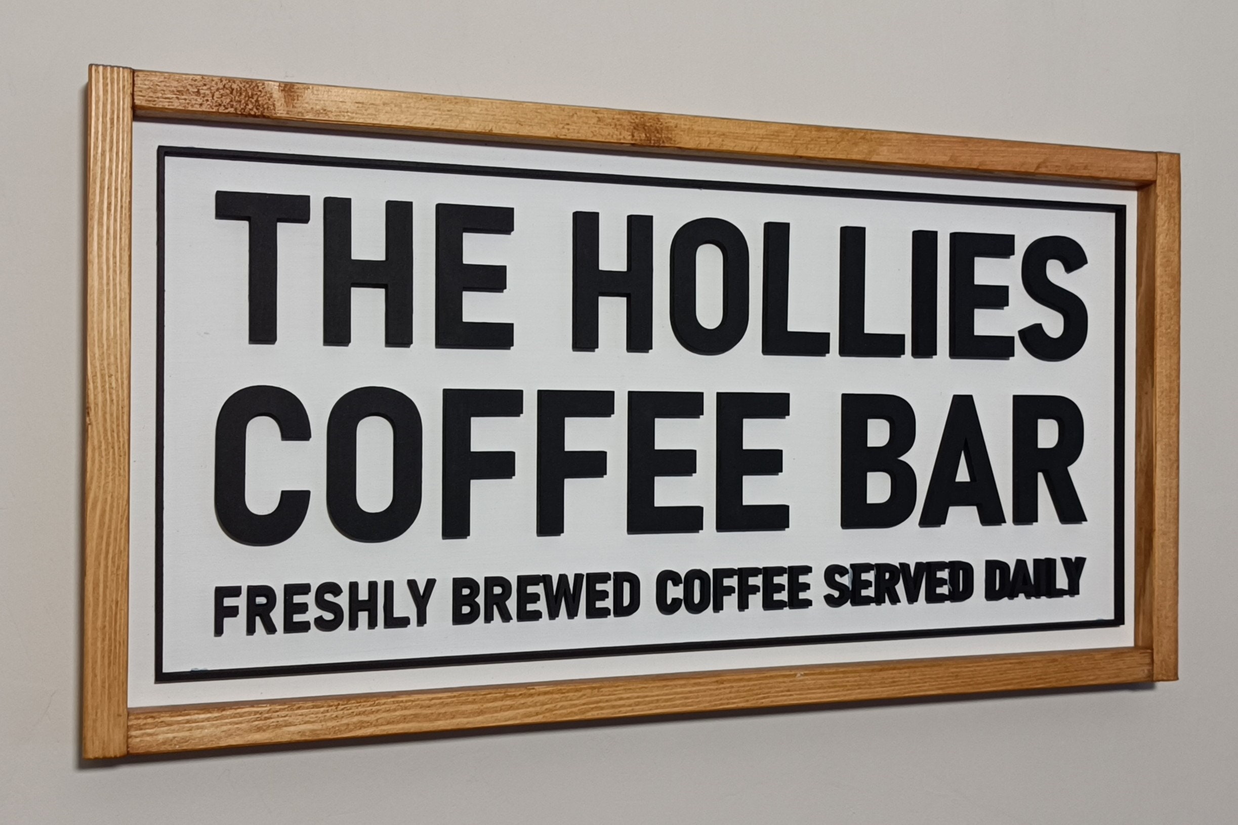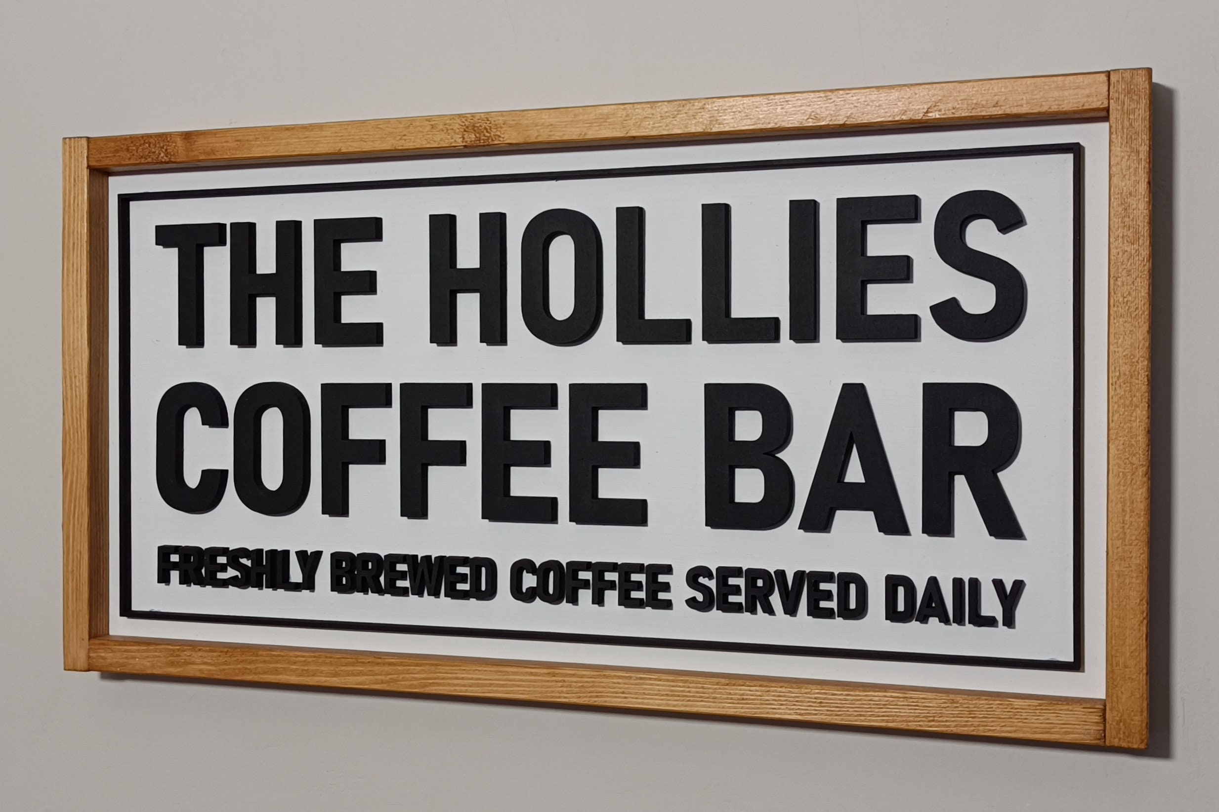 This unique sign uses a bold font design that is laser cut in 6mm MDF and painted in a blackboard paint to really stand out against the background which is made from solid birch plywood before being painted matt white. The whole sign is then mounted in a sturdy wooden frame which is varnished in an Oak stain to really set off the finished sign