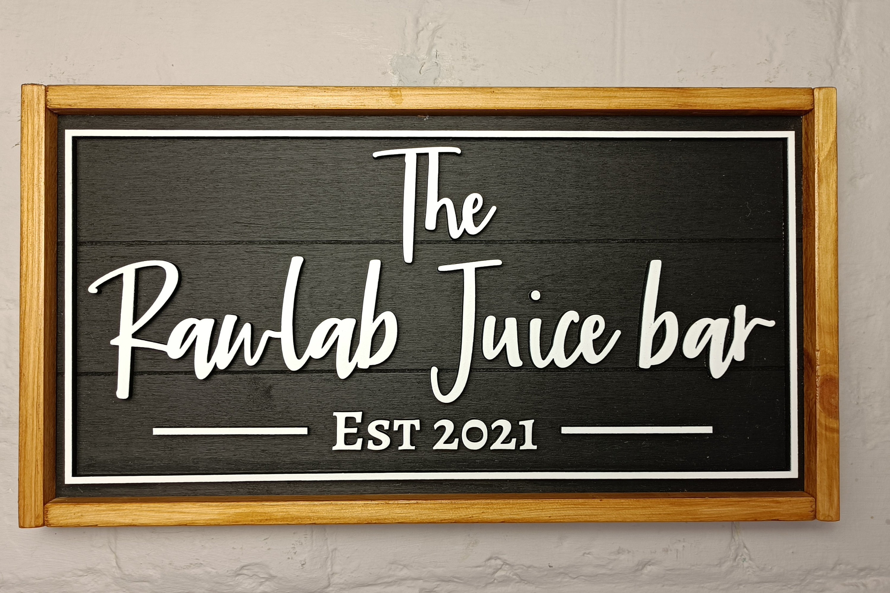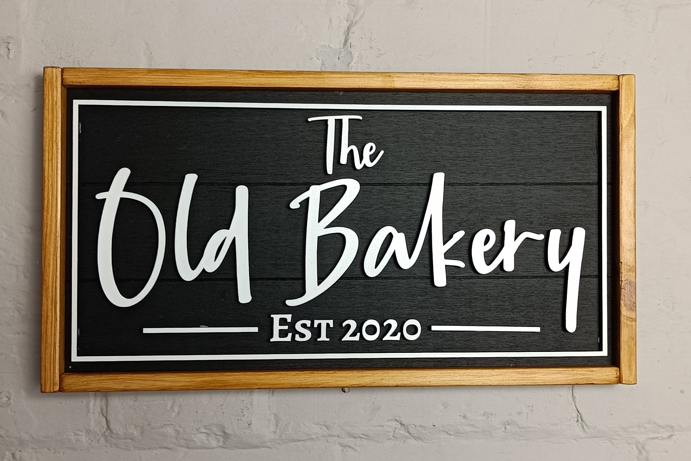 The background of the sign is made from birch plywood which has lines engraved in it and is painted with blackboard paint. The letters are cut from quality MDF and are painted with satin white paint to contrast with the background and to give a raised 3D finish. The frame is made from solid pine which is stained in a country oak stain to complete the look.