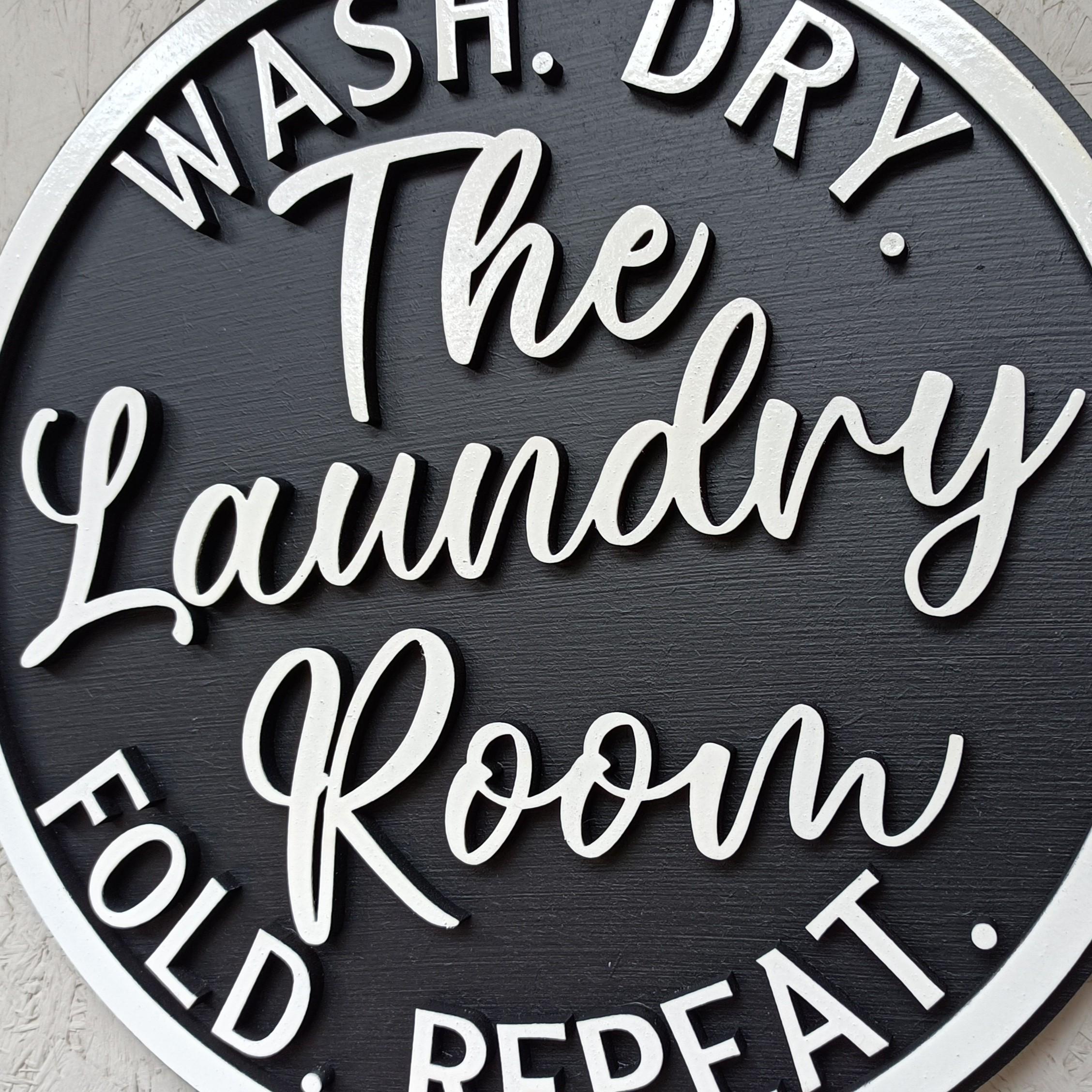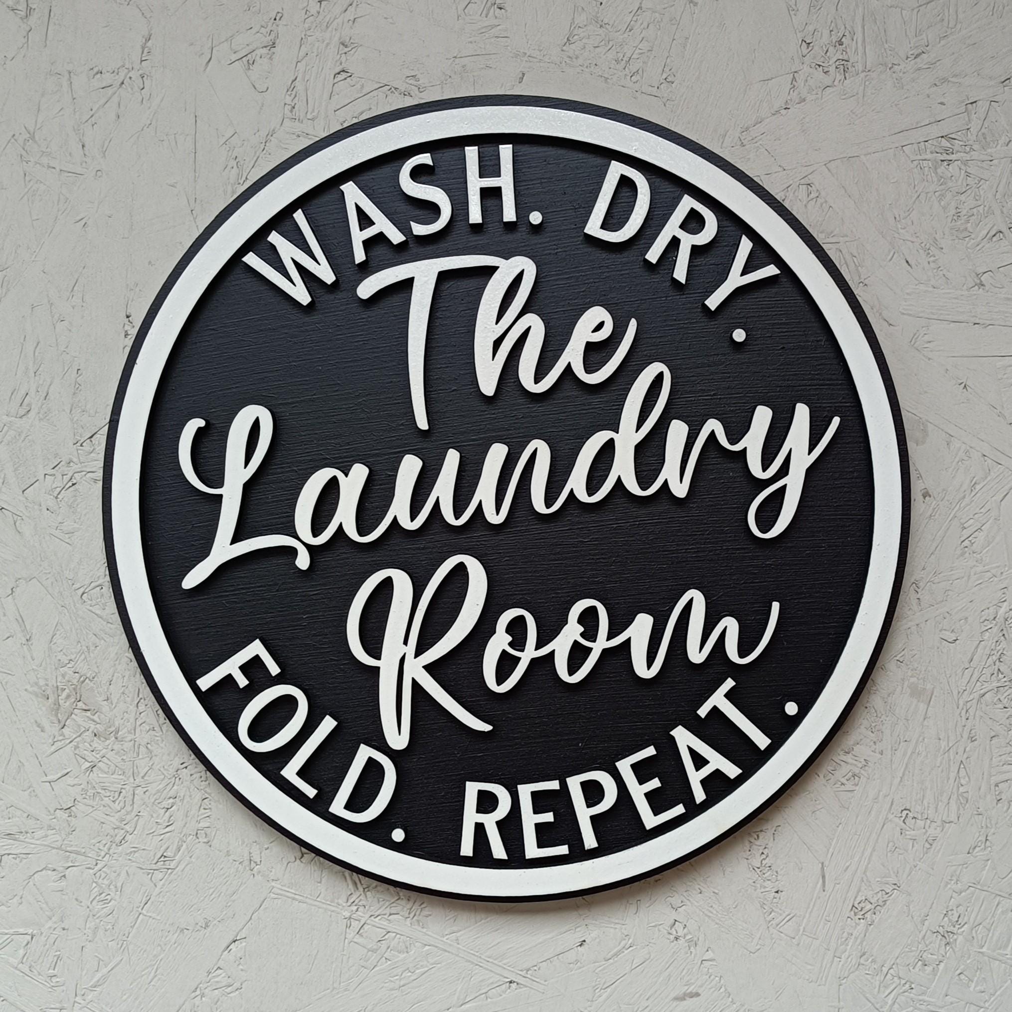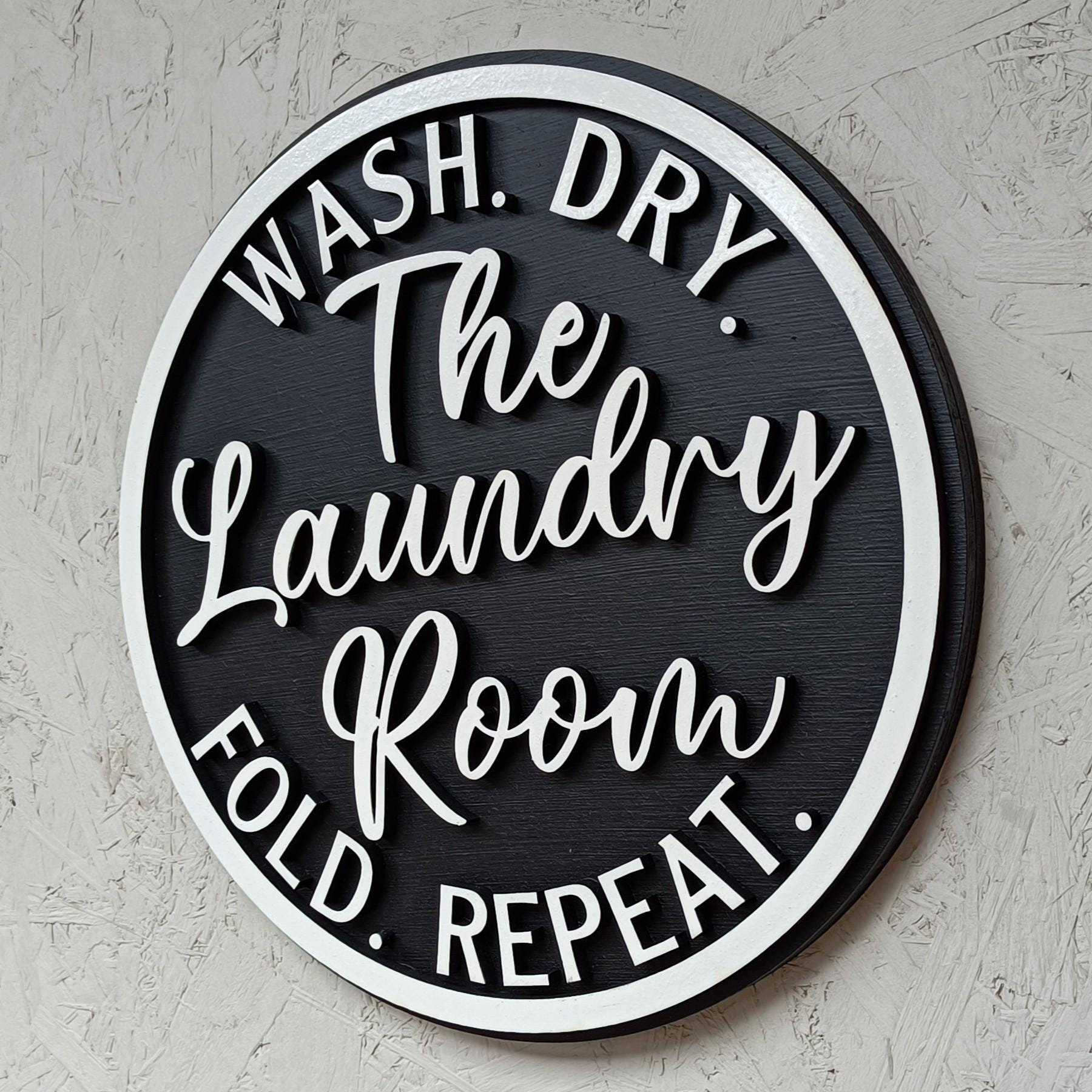 With 'the Laundry Room' across the centre in a cursive font and wash. dry. fold. repeat. around the perimeter this sign really makes a statement