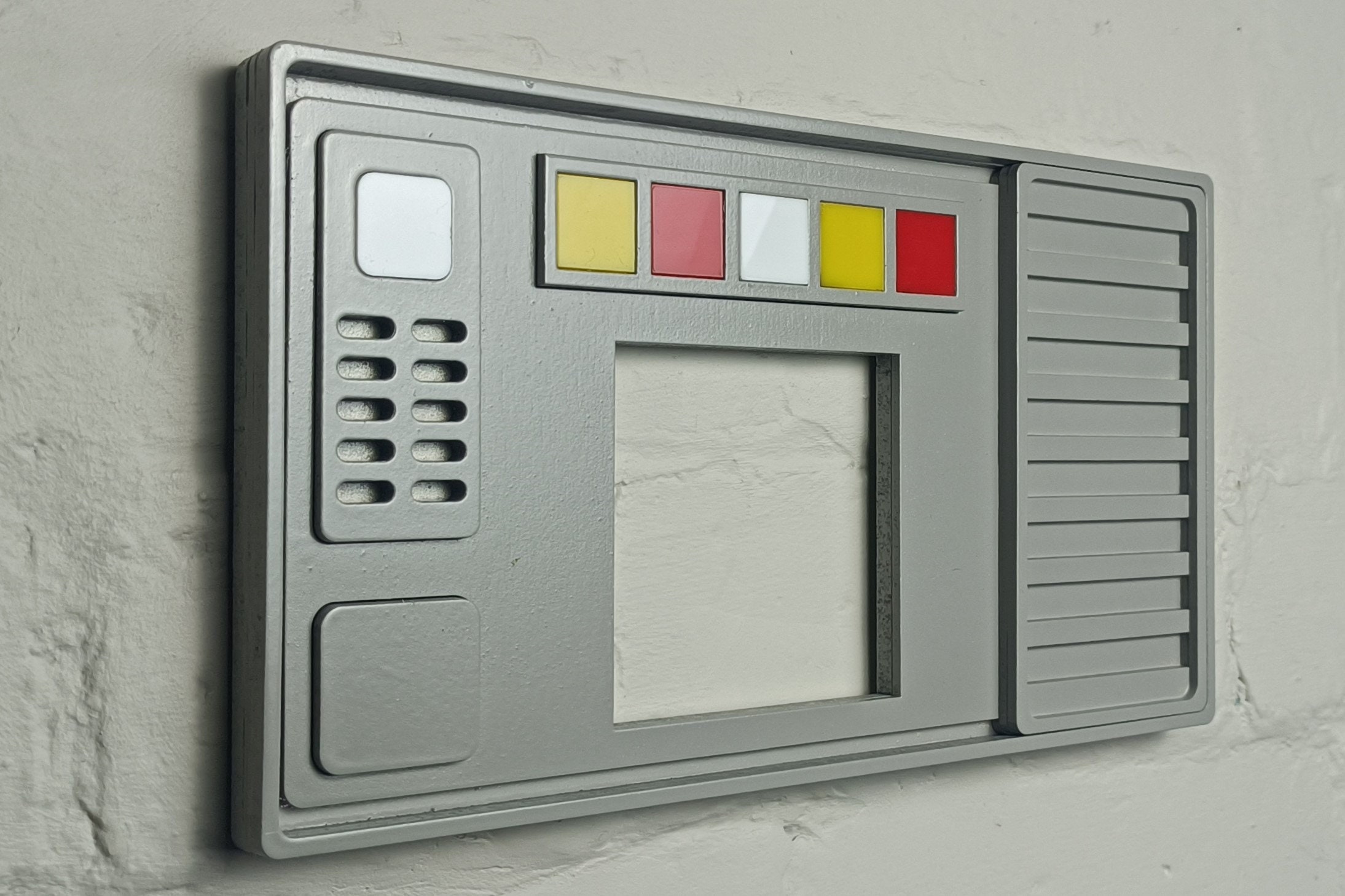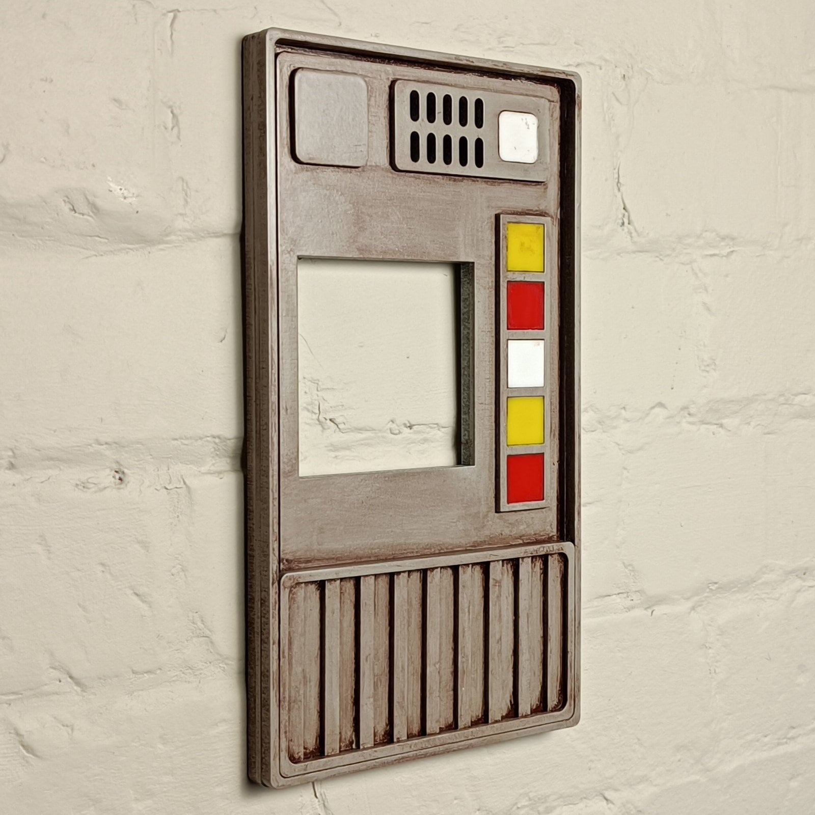 The panel is made from different thickness's of MDF to create the 3D effect, painted with stone grey paint and with gloss red, white & yellow acrylic accent details to really stand out against the mid sheen base. You can choose to have it clean like it just came off the production line or weathered to match the used future look!