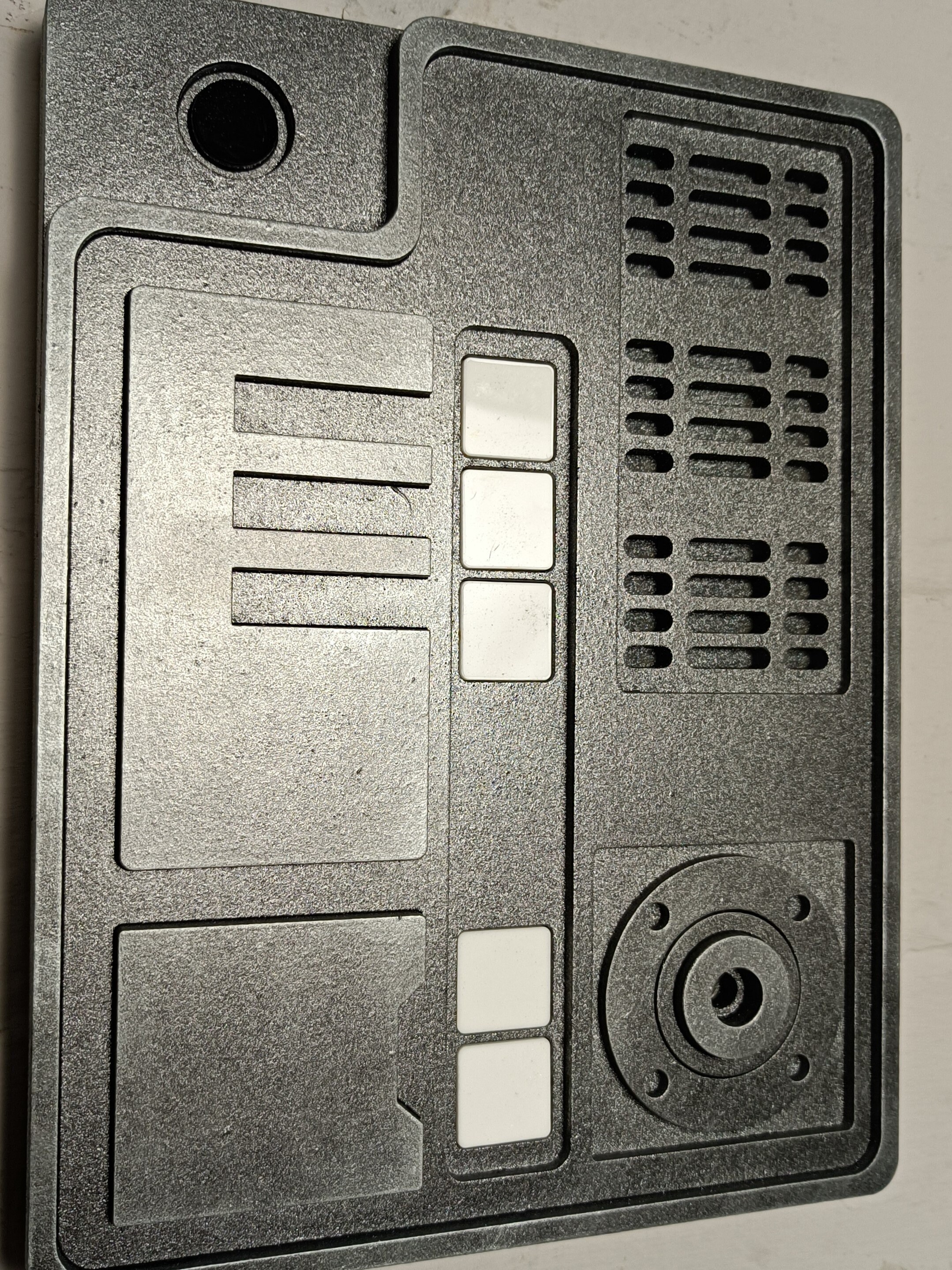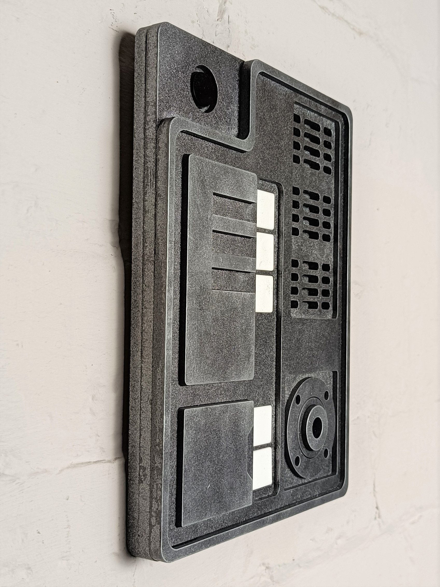 The panel is made from different thickness's of MDF that is layered to create the 3D effect. The panel is painted with in gun metal metallic paint and has a light dry brushing of silver paint to really enhance the details and also to give it the 'used future' look.